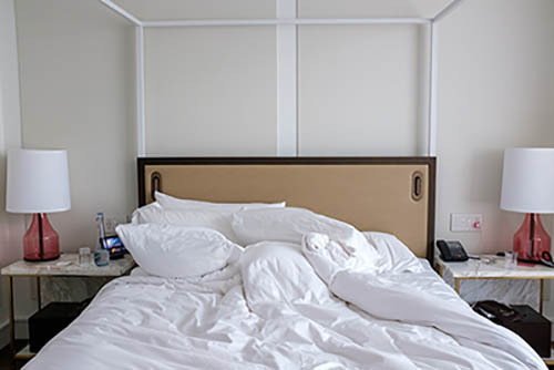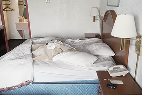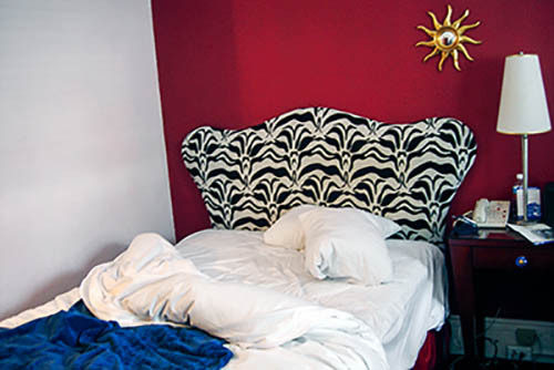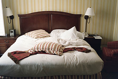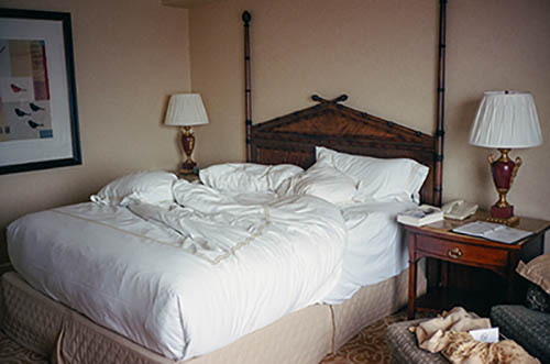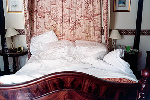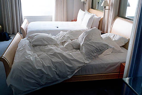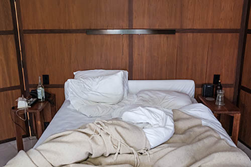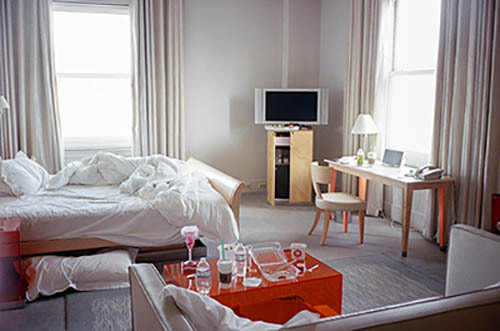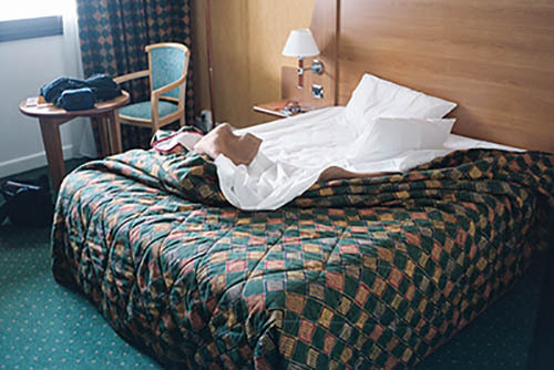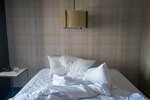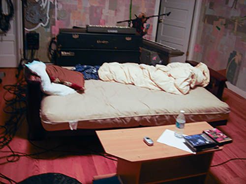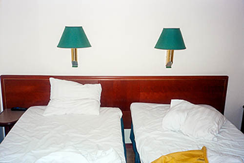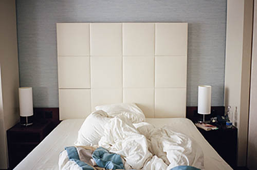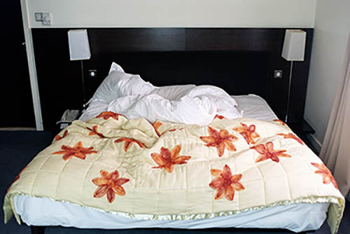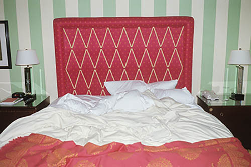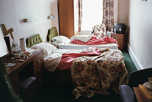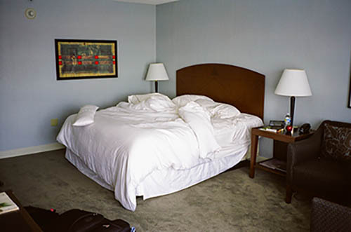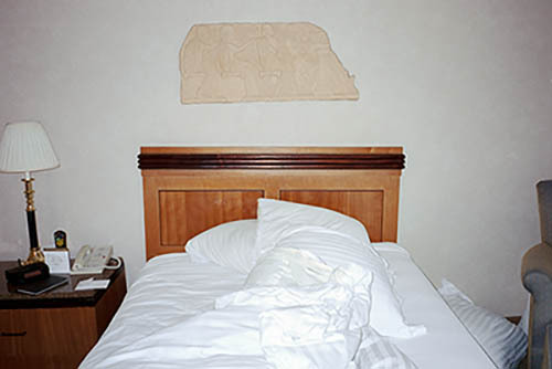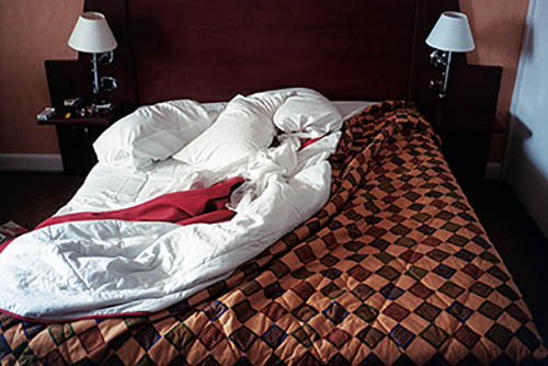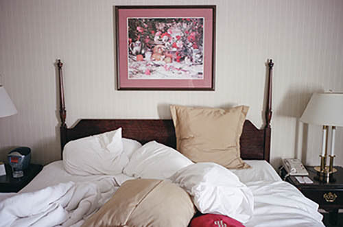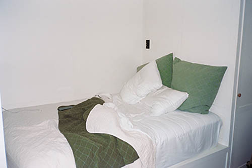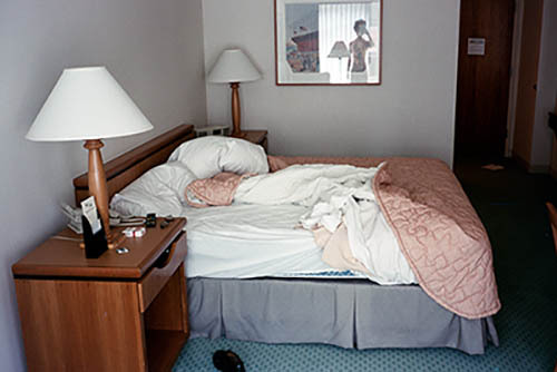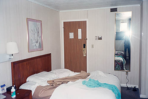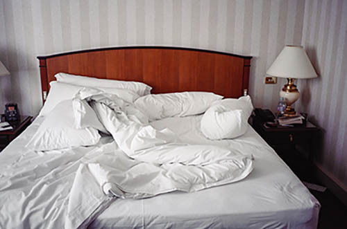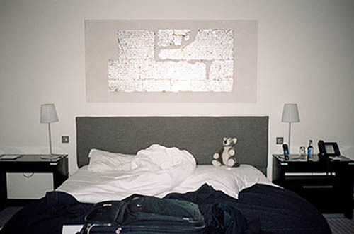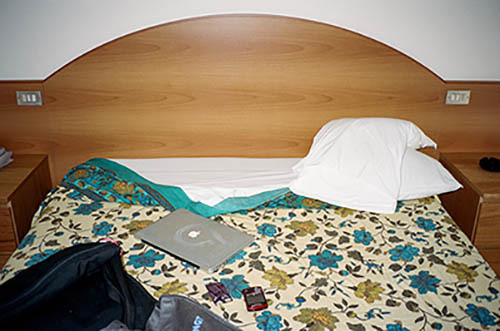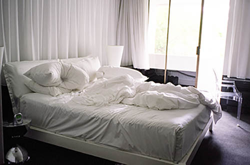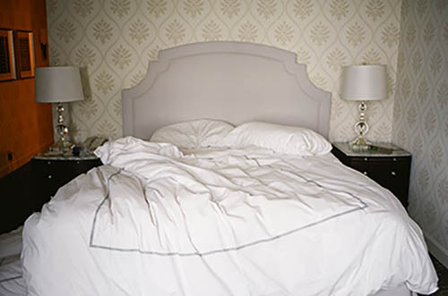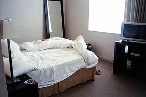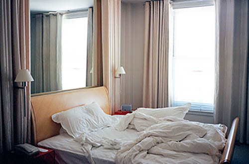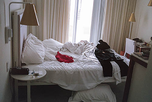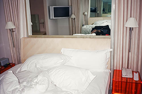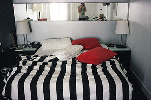 Nick Zinner über diese Serie, die 320 Fotografien umfasst: „Als ich jünger war, war ich besessen davon, die Zeit zu dokumentieren, sobald mir klar wurde, dass sie vergeht. So begann ich die Serie „Slept in Beds“ noch bevor ich Teil einer tourenden Band wurde, mitganzen Nachtaufnahmen von mir selbst beim Schlafen mithilfe einer einfachen Lochkamera mit Polaroid-Rückseite. Ich suchte nach Beweisen und einer Erinnerung an eine Zeit und einen Raum, die ich sonst unweigerlich vergessen würde. Neben den Merkmalen des Katalogisierens und der spielerische Fixierung habe ich die Arbeit von Bernd undHilla Becher sowie Sophie Calle immer sehr geschätzt. Alsunsere Band begann zu reisen und touren, habe ich allesdokumentiert – jede Menschenmenge, jedes Bett. Ich wolltenicht, dass alles wieder verschwindet, zumal viele derStrukturen gleich waren – Menschen, Details und Orte. Ichwollte ein Andenken an jedes Erlebnis und jeden Ort haben,an dem es eine Schönheit und Einsamkeit gibt, über dieMillionen Lieder geschrieben wurden.“