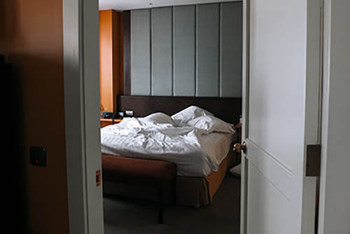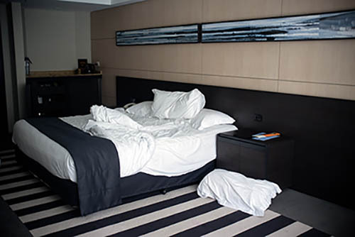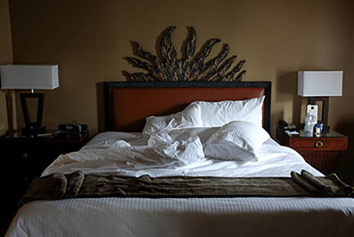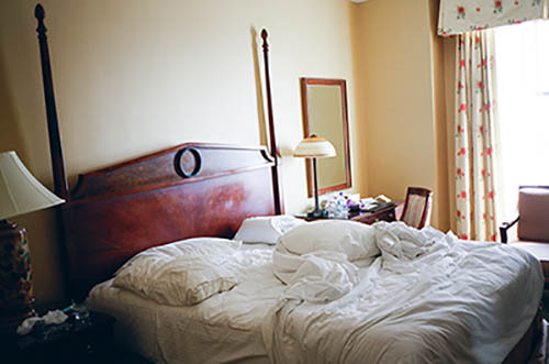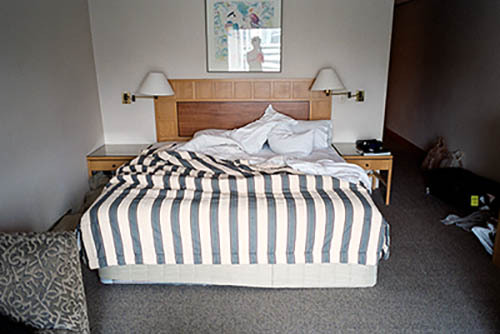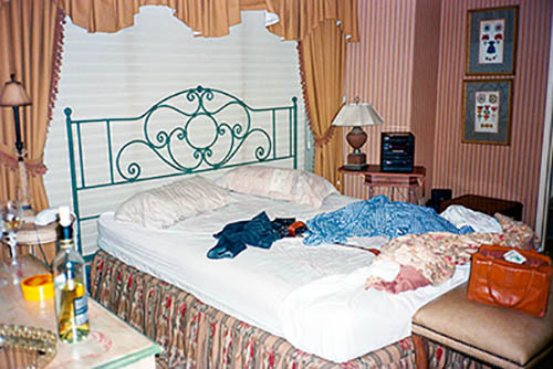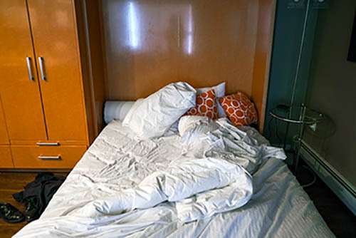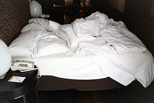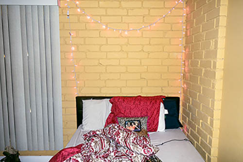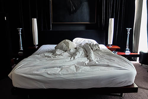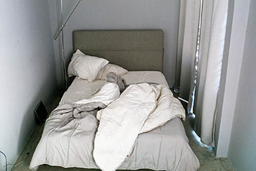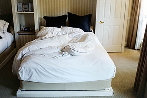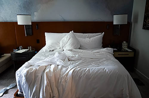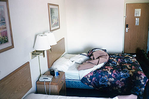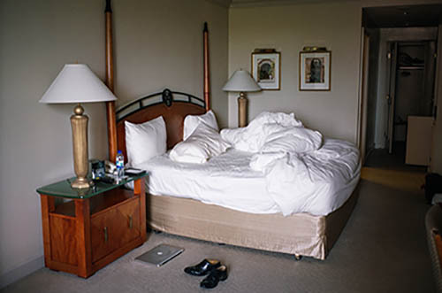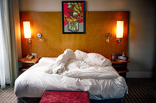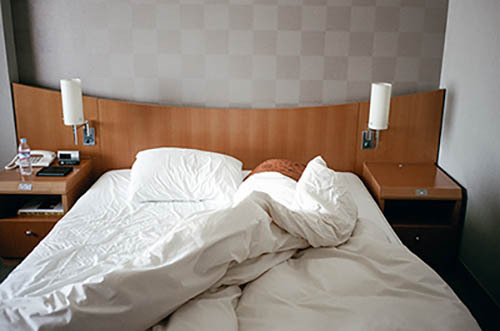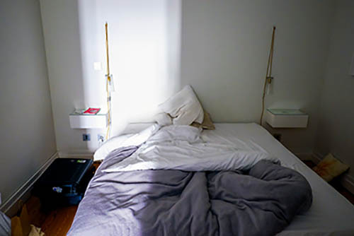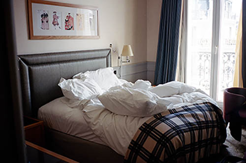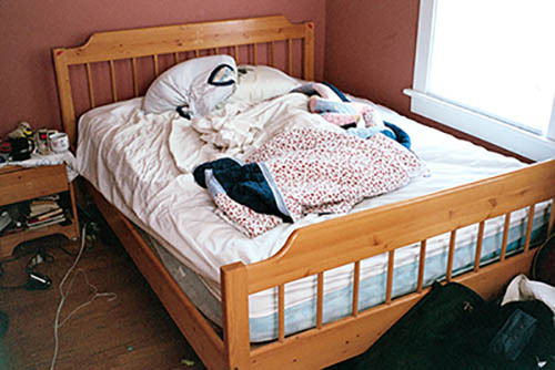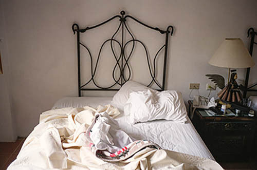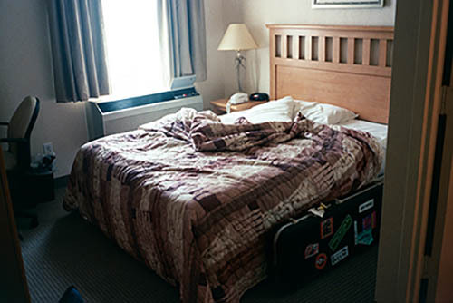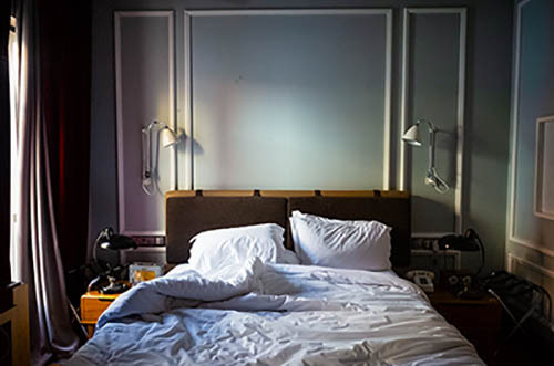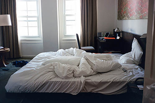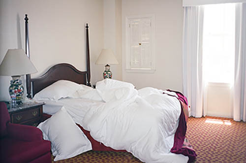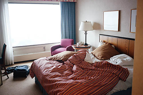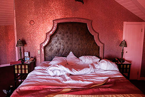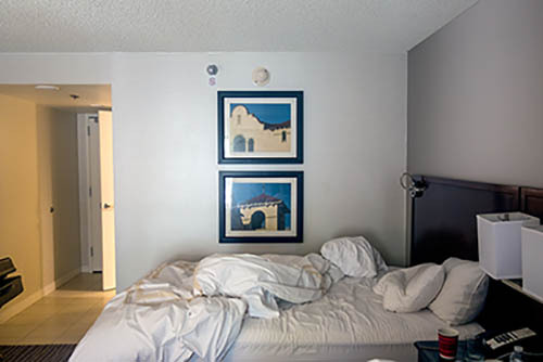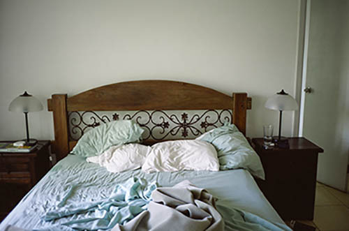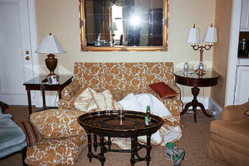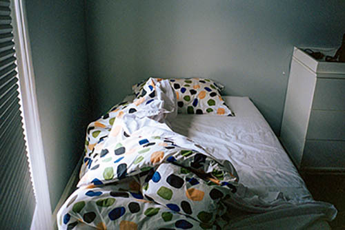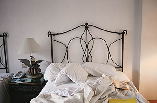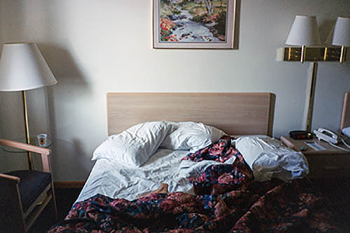 Nick Zinner über diese Serie, die 320 Fotografien umfasst: „Als ich jünger war, war ich besessen davon, die Zeit zu dokumentieren, sobald mir klar wurde, dass sie vergeht. So begann ich die Serie „Slept in Beds“ noch bevor ich Teil einer tourenden Band wurde, mitganzen Nachtaufnahmen von mir selbst beim Schlafen mithilfe einer einfachen Lochkamera mit Polaroid-Rückseite. Ich suchte nach Beweisen und einer Erinnerung an eine Zeit und einen Raum, die ich sonst unweigerlich vergessen würde. Neben den Merkmalen des Katalogisierens und der spielerische Fixierung habe ich die Arbeit von Bernd undHilla Becher sowie Sophie Calle immer sehr geschätzt. Alsunsere Band begann zu reisen und touren, habe ich allesdokumentiert – jede Menschenmenge, jedes Bett. Ich wolltenicht, dass alles wieder verschwindet, zumal viele derStrukturen gleich waren – Menschen, Details und Orte. Ichwollte ein Andenken an jedes Erlebnis und jeden Ort haben,an dem es eine Schönheit und Einsamkeit gibt, über dieMillionen Lieder geschrieben wurden.“